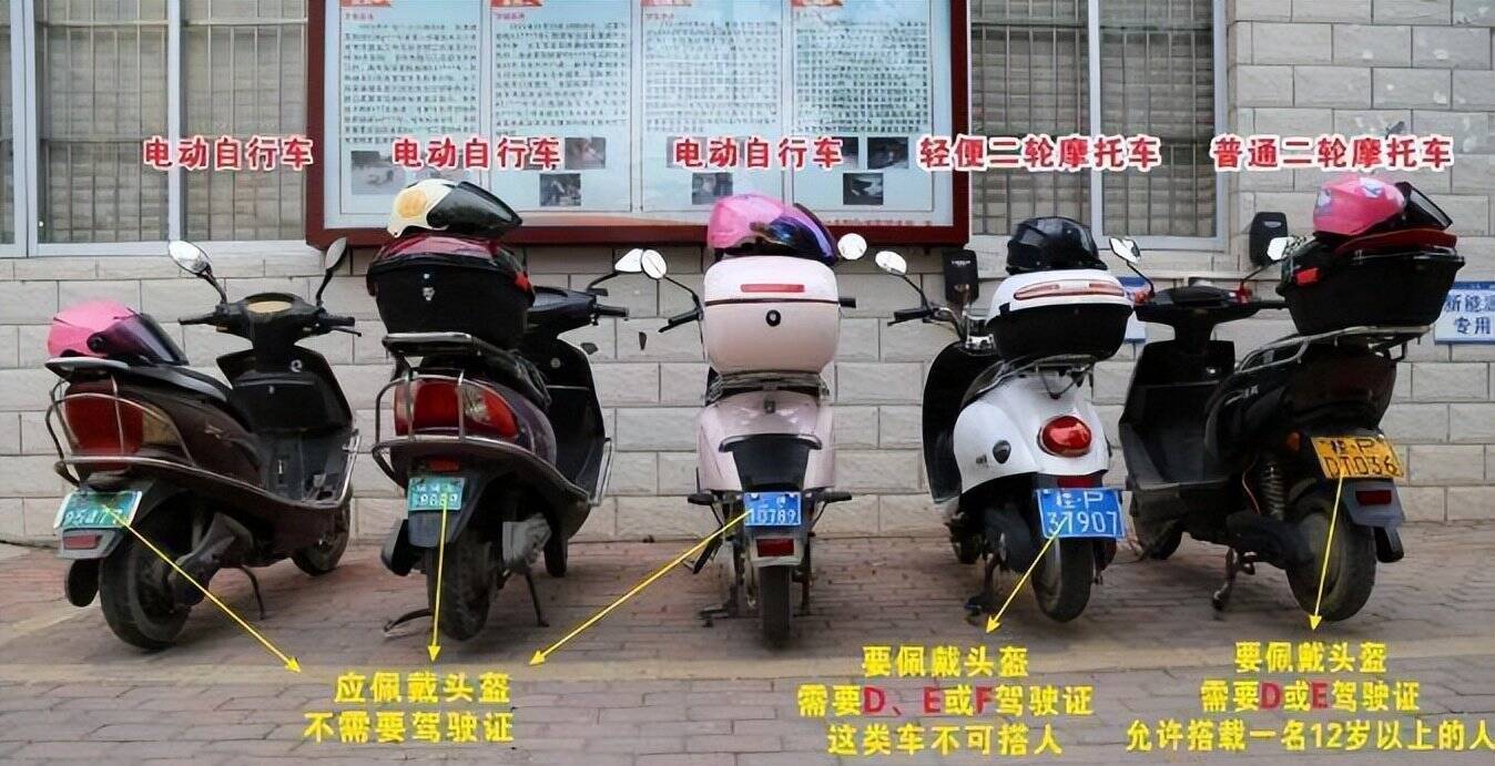 蓝牌(电动轻便摩托车):属机动车,需F证及交强险,走机动车道最右侧,严禁载人。